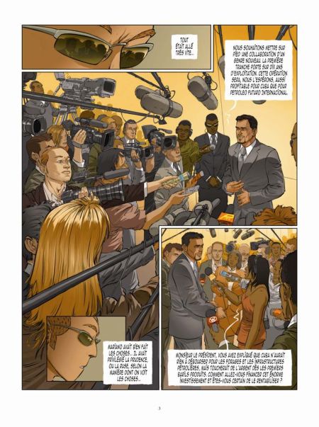 L’entreprise Petroleo Futuro Internacional dirigé par le trio de criminel tente de s’imposer. Mais dès qu’il est question de pétrole, les états et leurs services secrets sont au taquet. Donc, nous avons encore le droit à une leçon de géopolitique comme dans les tomes précédents. L’Afrique est encore cité. « La compagnie pétrolière Exxon Mobil est plus riche que la Pakistan ou le Pérou… Son chiffre d’affaire équivaut au budget de tous les pays d’Afrique réunis… Mercedes-Benz est plus riche que le Nigéria tout entier, qui appartient pourtant à l’O.P.E.P., ou que plusieurs d’Afrique réunis… Pourtant, l’Afrique détient d’énormes ressources naturelles de toutes sortes. Pétrole, or, diamants, cadé, etc. De quoi être riches, ou en tout cas moins pauvres qu’ils ne le sont… (…) Parmi les 100 sociétés les plus riches du monde, 16 sont dans le pétrole, 13 sont des banques et 13 des compagnies d’assurance. 51 sont européennes, 31 étasuniennes et 15 asiatiques , ce qui fait 97… Ca donne une idée assez précise du monde dans lequel nous vivons. » (p. 30). Progressivement, les choses se complexifient.