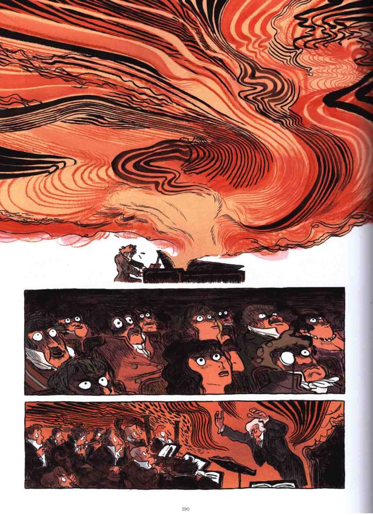 Quand on regarde la couverture, on tombe sous le charme. Un garçon passionné devant un piano et la création semble extraordinaire. Le trait, qui fait penser à celui de Catherine Meurisse, intrigue. On veut absolument aller plus loin et savoir ce que nous réserve Mikaël Ross. Par contre, pour les fan de Ludwig von Beethoven, ce n’est pas une biographie officielle. C’est une fiction drôle et sensible, il a pris quelques libertés scénaristiques. Bien souvent, c’est très irrévérencieux et on apprécie ça. On rencontre un Mozart ultra-narcissique, un père raté et alcoolique, une voisine bienveillante et loufoque… La misère côtoie la richesse avec des frontières très poreuses. L’art est aussi un milieu qui peu facilement aller d’un espace à l’autre. Le piano est un instrument de posture sociale. Heureusement que l’enfant précoce avait un talent pour créer des morceaux jamais entendu. La retranscription de l’émotion produite est fabuleuse. Impossible de pas y transcrire une émotion musicale que l’on aurait déjà ressenti. Personne n’est neutre face à la musique. Puis, le gamin grandit et découvre les premiers émois, l’envie de faire l’amour, d’embrasser et l’angoisse qui se présente sous forme de diarrhée. Quand on arrive après les 200 pages, on aurait bien envie de poursuivre. Surtout que Ludwig commence à perdre l’audition. Mais non, les choses s’arrêtent ici. Comme quoi, une fois que l’on se plonge dans un récit très bien construit on ne veut plus le quitter.
