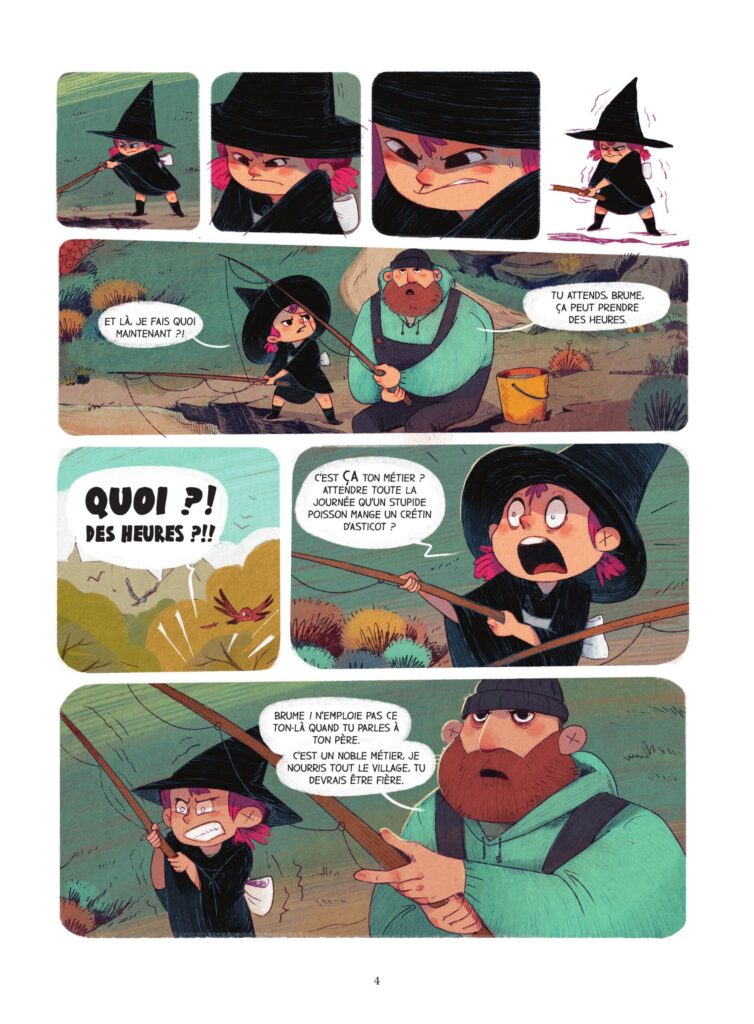 Brume veut impérativement devenir sorcière à l’image de son héroïne. Son père, très gentil, très aimant va l’aider dans sa passion. Pour arriver à son objectif, elle achète un chaudron, se rapproche d’Hugo et décide de partir en quête. Suite à une bêtise qui a couvert la ville de brume, elle doit partir trouver une solution en terrassant le dragon. On assiste à une magnifique scène d’action où la magie change tout. C’est drôle, pétillant avec une bonne dose d’humour. Les rebondissements ponctuent la dynamique de lecture. On veut impérativement retrouver le trio d’aventuriers pour de nouvelles surprises. Jérôme Pelissier et Carine Hinder ont vraiment bien fait de quitter leur emploi et de déménager pour devenir bédéastes. Aucun doute qu’ils vont toujours nos proposer de très belles propositions qui plairont autant aux plus jeunes qu’aux adultes.
