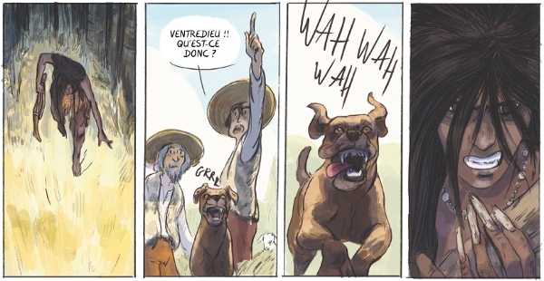 Impossible de ne pas être alpagué par la couverture. Une jeune femme dévore crue une grenouille au bord de l’étang. Qui est-elle? Pourquoi est-elle réduite à ça? Que faut-il voir dans son regard rebelle? Le titre « Sauvage » nous propose un très grand éventail de réponses à nos interrogations. Un jour elle s’est rapproché de la civilisation et elle est devenue un pôle de curiosité. Les gens ont eu à la fois très peur et très heureux d’une curiosité. Les catholiques dictent les règles entre le bien et le mal avec des règles fallacieuses. Selon l’interlocuteur, certains prônent la bonté et beaucoup d’autres le rejet. Dans tous les cas, il faut la convertir à la vraie et unique foi. Qu’importe la violence que cela génère. D’ailleurs, en trame de fond, on voit la conquête de territoire où l’on tue à tour de bras pour voler des terres et imposer une croyance pour mieux contrôler. Les morts sont nombreux et les traumatismes profonds. L’Homme est prêt à tout pour agrandir son pouvoir. Les victimes qu’importe tant que cela ne les touche pas directement et ne nuisent pas à l’essor des activités. Le massacre des indiens est une chose ordinaire. Cette « sauvage » est une enfant rescapée, utilisée, manipulée, brisée… qui s’est toujours adaptée. Il lui a fallu du temps pour s’affranchir des règles et trouver la liberté. Heureusement que des gens riches l’ont aidé en contre partie d’un divertissement douteux. La vie est toujours un long fleuve complexe.