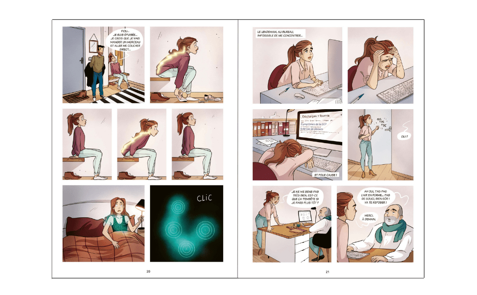 Quand on regarde la couverture, on sait que l’on va aborder un sujet autour de la question de la santé. Très vite, on découvre le thème abordé avec la sclérose en plaque. Une maladie qui n’a jamais été abordé. On est très intéressée pour en savoir plus sur cette pathologie, son évolution et son impact sur le quotidien. Mais très vite, le partie pris refroidi. On suite une jeune femme, Alex, 27 ans, belle, mince, heureuse dans son travail, épanouie dans son travail et avec de nombreux très bons amis. Déjà, le portrait semble beaucoup trop idyllique pour être vraisemblable. Avec dans sa belle famille des médecins, elle arrive à faire rapidement les examens et avoir un rendez-vous chez le neurologue. Déjà, pour arriver à avoir des réponses il faut avoir du réseau. Un rendez-vous chez le neurologue se calcule en mois d’habitude sauf si vous payez les consultations sans prise en charge par la sécurité sociale. Puis même si les choses semblent assez rapide, bien que l’on nous parle d’un peu d’attente. Malgré quelques doutes, elle finit par être toujours rassuré, tout son entourage est là, à l’écoute. Elle arrive à avoir deux enfants sans souci et les enfants sont toujours très gentils. Ils sont compréhensifs et sans l’empathie malgré leur très jeune âge. Les deux garçons ne sont jamais jaloux et au contraire, s’aiment toujours. Ce n’est pas du tout réaliste. C’est dommage de montrer des gens parfait pour parler d’un sujet aussi sensible. Car cela amoindri les conséquences de la maladie et des effets secondaires des traitements. Il faut juste un temps d’adaptation et après les choses vont bien. Ce n’est pas nécessaire de garder le secret si on veut que son entourage comprennent. Ainsi qu’avec ou sans enfant, son quotidien n’a pas changé et avec sa maladie, maintenant tout va bien. L’accent sur les troubles émotionnels me semblent léger avec un rapport au temps qui va trop vite. Dommage de ne pas avoir fait quelqu’un de vrai, auquel on peut s’identifier. Aucun doute que l’on sent que le témoignage soit bien présent. Pourquoi avoir tout édulcoré? Par contre, le fait de symboliser la maladie à travers un anima, présent en couverture, est assez ingénieux même si cela reste très courant comme représentation. Et le fait d’illustrer les sensations avec des fourmis permet de bien transmettre le ressenti. La bd a le mérite d’exister et de donner un visage à une maladie qui peut pourrir la vie.