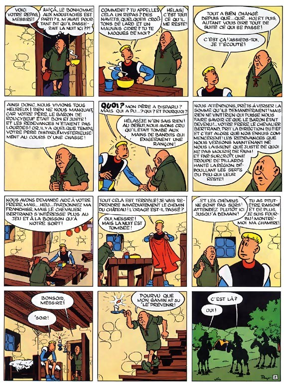 Le jeune page du roi prend de la hauteur en faisant règle l’ordre et la justice. Le baron de Roucybeuf a disparu de façon assez étrange. Puis en l’absence d’Hughes, le fils ainé, celui qui se fait appeler le maitre de Roucybeuf le peuple. Pour garder le pouvoir, il est prêt à tout, même à des meurtres. Johan s’entoure d’hommes de morale pour changer la situation. Déjà, il doit identifier les personnes de confiance au sein du château alors il tend des pièges. C’est important de s’avoir sur qui s’appuyer. Hughes a été empoisonné et il a été sauvé grâce à une sorcière/guérisseuse. Une femme qui vie isolée dans la nature, il faut s’en méfier. La stupidité et la misogynie se montrent dans leur splendeur. Une femme qui choisit un style de vie particulier est forcément dangereux. Connaître les plantes semblent très dangereux. Alors on met de la sorcellerie là-dessus. Heureusement qu’aucun signe religieux n’apparaît même si l’on connait l’orientation de Dupuis. La vieille Rachelle est la seule à pouvoir sauver Hughes donc elle reste quelqu’un d’essentiel. Quand on a séparé le bon grain de l’ivraie, une stratégie se déploie. Quelle belle occasion de mettre en place de nombreuses scènes avec des rebondissements amenant à des combats. On trouve toujours une pointe d’humour ici et là avec une pointe d’espièglerie. Pas le temps de souffler de la première à la dernière page. Une mise en bouche pour une arrivée très prochaine de Pirlouit.