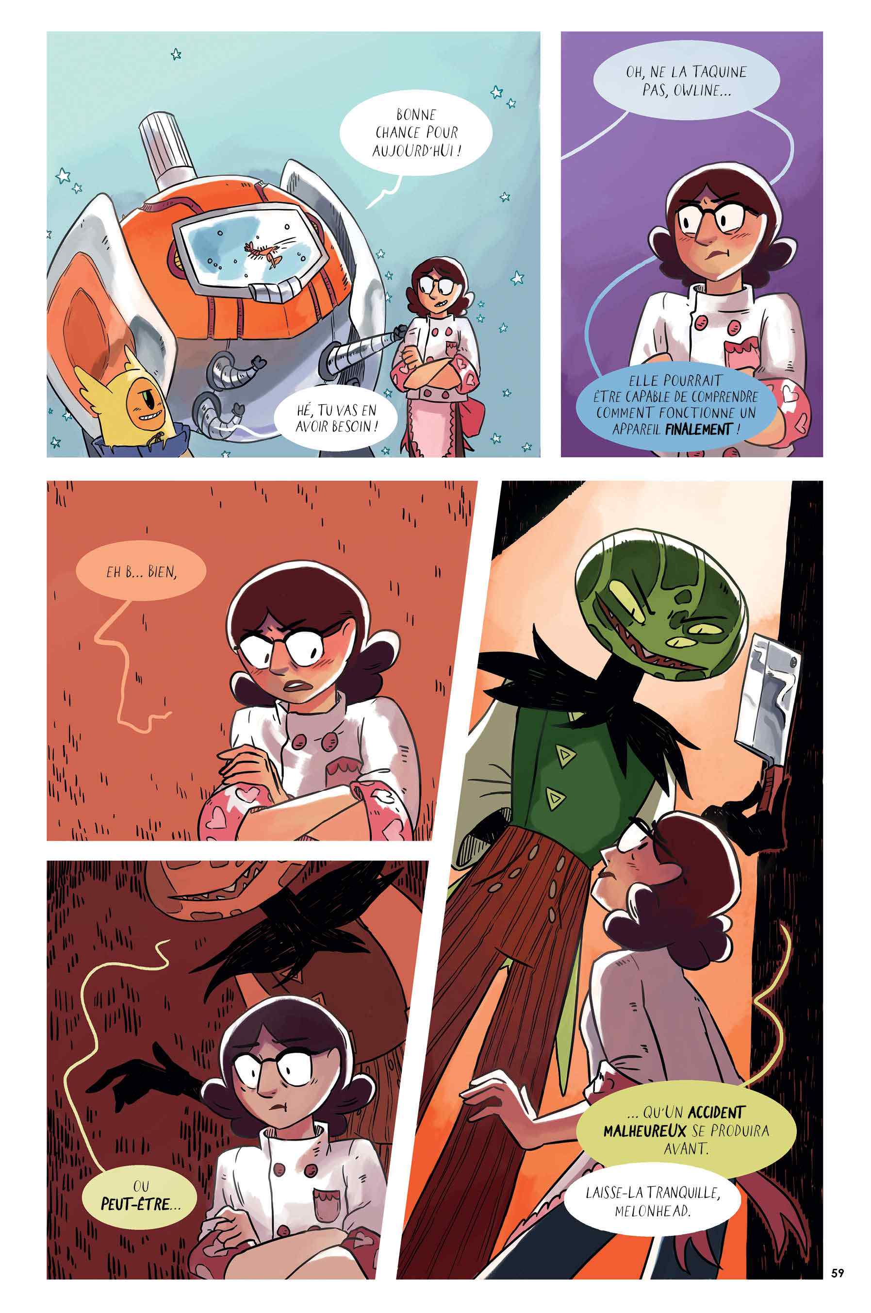 Dès la première page, on se laisse porter par l’improbable et le surprenant. Les couleurs vives contribuent à donner du dynamisme qui met en valeur des rebondissements. La structuration du récit et de certains plans font penser autant aux mangas qu’aux comics. Nous sommes dans l’action avec des personnages aux gros yeux. Une influence qui plaira d’autant plus aux jeunes lecteurs baignés dans les supers héros aussi bien nippon qu’américain. Très vite, les personnages mals intentionnés se distinguent de ceux qui se passionnent véritablement pour la cuisine. Comme la précédente candidate que remplace Peony disparaît fortuitement, on se doute bien que quelque chose va arriver à notre héroïne terrienne. Son enlèvement permet de conclure le tome avec curiosité car on a envie de savoir où elle va et comment les autres vont aller la sauver. Une bonne accroche qui donne envie de se plonger dans le deuxième tome.