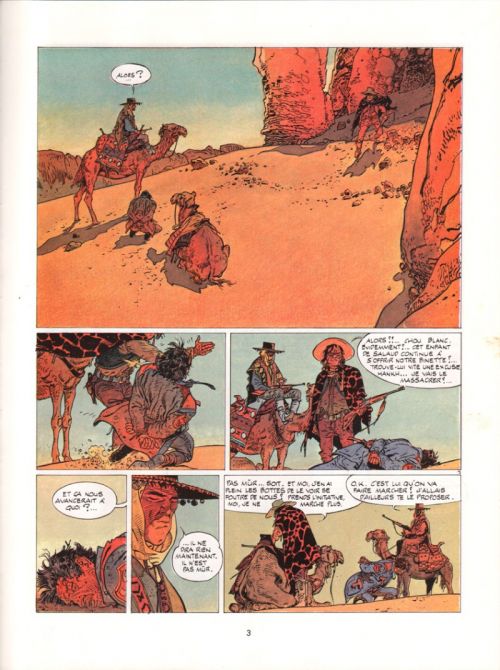 Le dessin est toujours assez repoussant. Donc c’est toujours un peu difficile de rentrer dans l’histoire tout de suite. Par chance, le scénario est vraiment travaillé aux petits oignons. Jeremiah et Kurdy apprennent à se connaître et se faire confiance. Ce lien est mis à rude épreuve quand ils sont perdus dans un désert qui semble infini. L’apparition d’un corps jeter met fin à leur dispute. Est-il mort? Non et il a une histoire bien curieuse à nous raconter. Sa tenue de l’armée a tendance à lui donner confiance. Très vite, on découvre l’entourloupe. A partir de là, on est emporté dans une aventure incroyable où l’on n’a pas le temps de dire ouf. On y croise des chameaux, des mules, des chevaux, un vélo, des soldats, des brigands dirigés par une femme, un fourgon blindé hypo-tracté, une scène de fouet, des courses poursuites, une marche à pied dans le désert sans eau… L’univers est d’une grande richesse et sans pour autant paraître en faire trop. Tout est cohérent et on se laisse porté. L’ingéniosité est de mise pour s’en sortir. La mort n’est jamais très loin. La justice est souvent aussi de mise et justifie bien des cadavres partout. Les personnages sont assez travaillés même si les codes du western sont respectés. Les seconds rôles comme la cheffe des brigands, bien qu’hypersexualisée, est une femme de poigne avec des objectifs clairs et qui se fait respecter par ces mecs sans foi ni loi. Malgré les dessins assez lourds, on admire les représentations des paysages, des villages, des détails dans les tenues… sans omettre la jolie gamme d’ocre du désert selon la position du soleil. Au final, tout finit bien et on a envie de retrouver notre duo intrépide. Ils ont l’art de se mettre dans des situations problématiques.