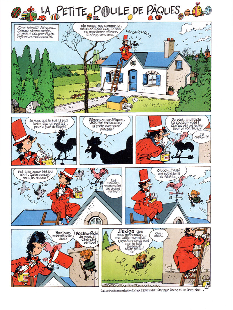 Quand on est une petite poule de Pâques, on voit du pays. Accrochée à sa petite cloche, on navigue entre les nuages, au-dessus des toits et des bois. Mais cela peut devenir dangereux quand un méchant braconnier à l’humeur féroce vous tire dessus. Touchée à l’aile, la petite cloche se voit contrainte à un atterrissage forcé. Recueillie et soignée par le bon docteur, elle conte ses malheurs. Quant à la petite poule capturée par le braconnier, son avenir est incertain : il lui faut pondre un oeuf en or ou passer à la casserole. Elle a beau se concentrer de toutes ses forces, rien n’y fait, les oeufs qu’elle pond sont toujours en chocolat. Heureusement, le docteur Poche et les enfants pourront intervenir pour sauver la petite poule jaune à coups de baguette magique, afin que la fête de Pâques soit respectée. Aidés par les animaux des bois, ils puniront le vilain braconnier, qui sera copieusement bombardé d’oeufs de Pâques. Deuxième album des nouvelles aventures du « Docteur Poche », cette fête de Pâques est l’occasion de retrouver tous les personnages chers à Wasterlain et de faire la connaissance de petits nouveaux bien sympathiques, la petite poule et le lapin bleu. Des histoires qui sont autant de cadeaux pour les enfants.