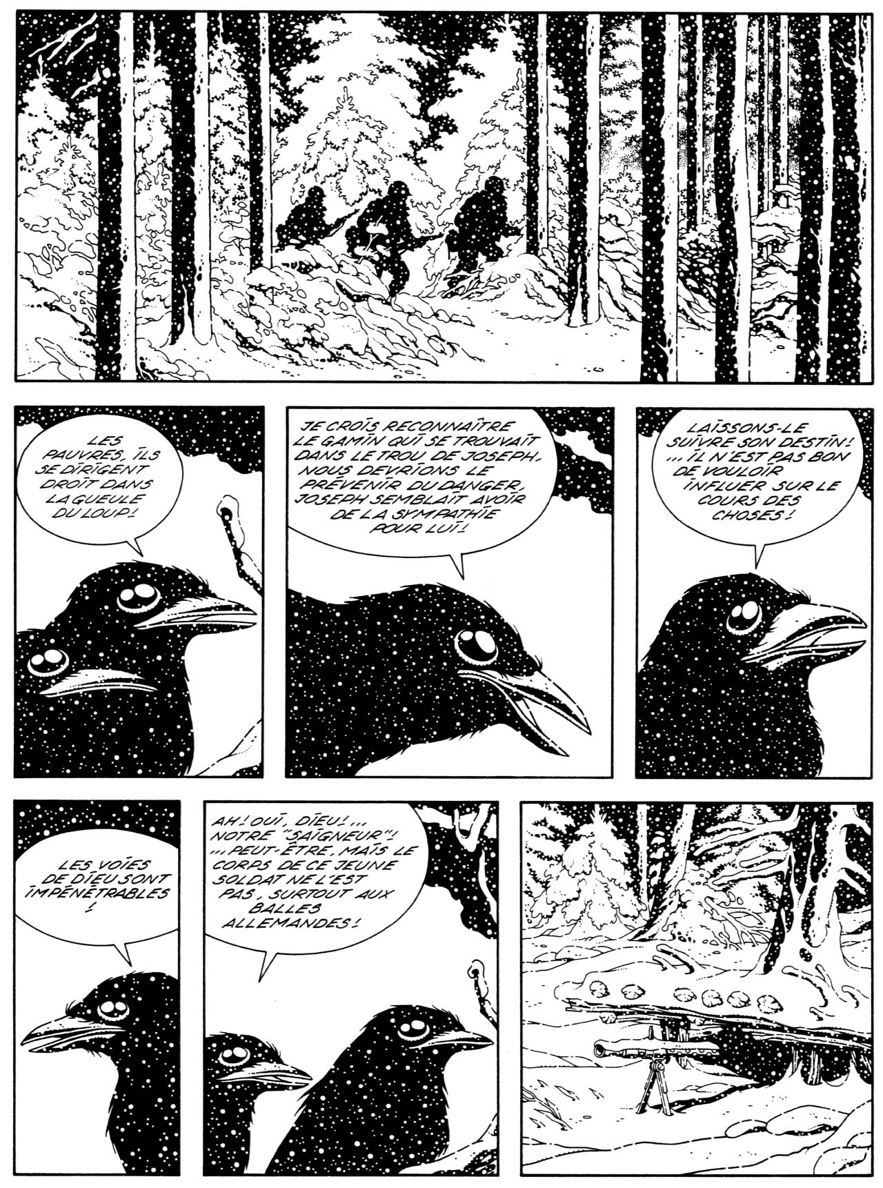 Quand on découvre la couverture, on sait que quelque chose d’horrible se passe. Le noir et blanc accentue la tension, la peur et l’horreur. On sait aussitôt que nous allons tomber dans un récit qui raconte la guerre. Très vite, nous sommes au coeur d’un conflit dans les Ardennes belges durant la Seconde Guerre mondiale. Le bleu, jeune américain sans expérience du combat doit rester auprès de la croix pour avoir une bonne vision de la zone et tirer si des allemands arrivent. Une chose improbable arrive car des fantômes qui apparaissent. Il fait connaissance avec Joseph, Manfred et Amédée. Cela donne des discussions assez improbables. Dans cette ambiance assez étrange, se déroule des choses improbables. Une amitié sincère se crée et s’ancre dans ce moment. Un sentiment d’impuissance s’installe et la nature joue aussi un rôle. La neige qui tombe recouvre ces milliers de cadavres et rend au paysage une apparence paisible. La mort se raconte à travers de nombreuses parties prenantes. Le regard des corbeaux ne manquent pas de sarcasme. Leur représentation correspond à celle de l’image d’Epinal. Le malaise est permanent à cela se rajoute l’horreur et l’épouvante. Le travail abrupte du noir et blanc rajoute une bonne dose d’inconfort. Le drame reste toujours identique qu’elle que soit l’affrontement et l’époque. Le monde ne tourne pas rond.