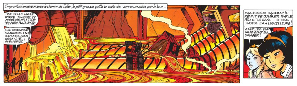 Le titre nous l’annonce, ça va être chaud. Vulcain, le dieu des forges entre en jeu, du moins, de façon métaphorique. Des humains font des forages et la BIM, ils tombent sur quelque chose d’improbable. Les techniciens viennent sur la plateforme et n’arrivent pas à comprendre. D’autant plus que des catastrophes naturelles débutent. Il y a un lien de causalité, Yoko Tsuno le sait. Direction la Martinique avec Pol et Vic pour résoudre ce problème. Derrière ça, il ne pouvait y avoir que des extraterrestres. Quel plaisir de retrouver les vinéens qui tentent de se créer un espace où vivre sur terre, d’où la dérogation de lave. « Ce genre d’explosion mettant en péril notre communauté, il devenait urgent de nous révéler aux terriens, en leur imposant notre droit de vivre à la surface de la terre… Sachant qu’aucun gouvernement ne nous céderait des terres, nous décidâmes d’utiliser un caprice de l’écorce terrestre pour créer un nouveau continent! » (p. 21). Mais cette nation pacifique a voté pour un dictateur. La situation créera sa disparition définitive. Puis l’aventurière avec ces amis vont régler le problème au péril de leur vie. Que ne faut-il pas faire pour sauver la planète? A la fin tout fini bien grâce au trio infernal qui sait tout faire et maîtrise la peur. Le savoir et l’amitié permettent de vivre des aventures hautes en couleurs.