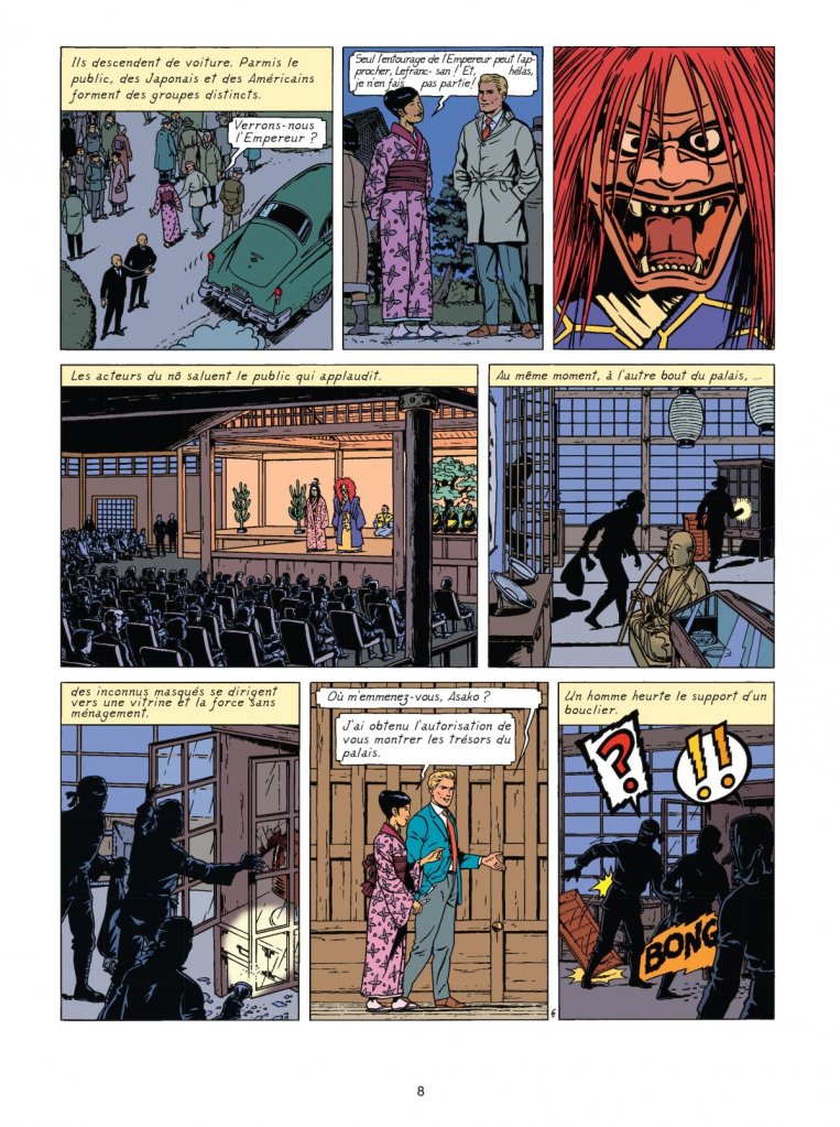 Ce qui est étonnant quand on lit un album de Lefranc repose sur l’aspect suranné. Pour une publication de 2012, on pourrait croire que l’on a quitté les années 50 depuis pas très longtemps. Tout sent le vieux, que cela soit le dessin, le choix de polices d’écriture, la structure du récit, les explications trop longues… Même Blake et Mortimer se sont mordernisés pour toucher un autre public. Mais là, tout reste dans son jus avec ses clichés trop lourd. Au moins, on n’a pas de surprise sur les rebondissements. L’histoire en tant que telle est assez tirée par les cheveux. Lefranc arrive au Japon occupé par les Américains. Le scénariste parle bombe sans parler du nucléaire. « Le déluge de feu qui s’abattit sur Tokyo la nuit du 9 au 10 mars 1945 causa la mort de milliers de civils, le plus souvent des femmes et des enfants. Les bombardements américains de cette nuit-là furent parmi les plus violents de la Seconde Guerre mondiale. » (p. 3). Les nazis n’acceptent pas la défaite et savent qu’ils trouveront des alliés au Japon avec ceux qui veulent restituer le shogunat. Forcément les choses tournent mal et la paix est sauvée. Le pseudo journaliste n’y est pas pour rien. Heureusement que des agents secrets aussi bien américains que japonais étaient là pour lui sauver la mise. Trop d’assurance peut nuire à sa survie. On retrouve un méchant récurent, Borg qui lui aussi déborde de certitude. Il dévoile toujours ces plans diaboliques. Tout est expliqué en long et en large et c’est très pesant. Le plaisir n’est pas au rendez-vous et convainc que souvent il faut évoluer avec son temps. Tout comme que le monde n’est pas réservé aux hommes.