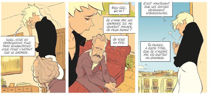 Quand on regarde la couverture, quelque chose nous interpelle. Qu’elle est le rapport entre cette belle personne et le texte écrit avec du rouge à lèvres? Doucement, on rentre dans l’intrigue assez originale. Jordi Lafebre choisit une forme originale pour nous plonger dans un polar. Déjà, le récit se déroule à Barcelone, dans notre époque. Eva Rojas est une femme libre, déterminée et qui porte avec elle ces fantômes. Progressivement, on découvre pourquoi elle est au coeur d’un récit. Pour reprendre du service, elle doit faire valider sa santé mentale auprès d’un confrère, Dr Llull. Elle lui raconte comment elle est arrivée au coeur d’une enquête policière. Pénélope, une ancienne patiente lui demande d’être présente pour la lecture du testament de la grand-mère pas encore morte. Ce moment est lourd de tension chez Les Monturós. La délectation sera au rendez-vous pour une psy qui voit les fêlures et les blessures. Ainsi son histoire personnelle et le meurtre s’entremêlent. On peut facilement faire un pont avec ses relations à sa famille qui sont rarement un long fleuve tranquille. Impossible de ne pas s’attacher à cette femme forte de caractère qui est entière et provocatrice. Elle devient enquêtrice en menant en parallèle de la police une enquête. Surtout cela confirme le savoir-faire du bédéaste qui nous avait déjà touché avec « Malgré tout » et la série « Les Beaux étés ». Les personnages ont tous des personnalités complexes et rien n’est simple. La curiosité est poussée jusqu’au bout car la complexité pour trouver le coupable est au rendez-vous. La particularité repose aussi sur la présence des femmes qui ont des rôles très divers et riches, autant responsable d’enquête que pilier de famille. Hors de question qu’elles soient secondaires ou juste faire valoir comme on peut trop en voir en bande dessinée classique. Une force qui distingue aussi ce polar qui tranche aussi avec le genre où le mec policier ou enquête prévaut. Bref, une lecture dense et complexe qui va en intriguer plus.