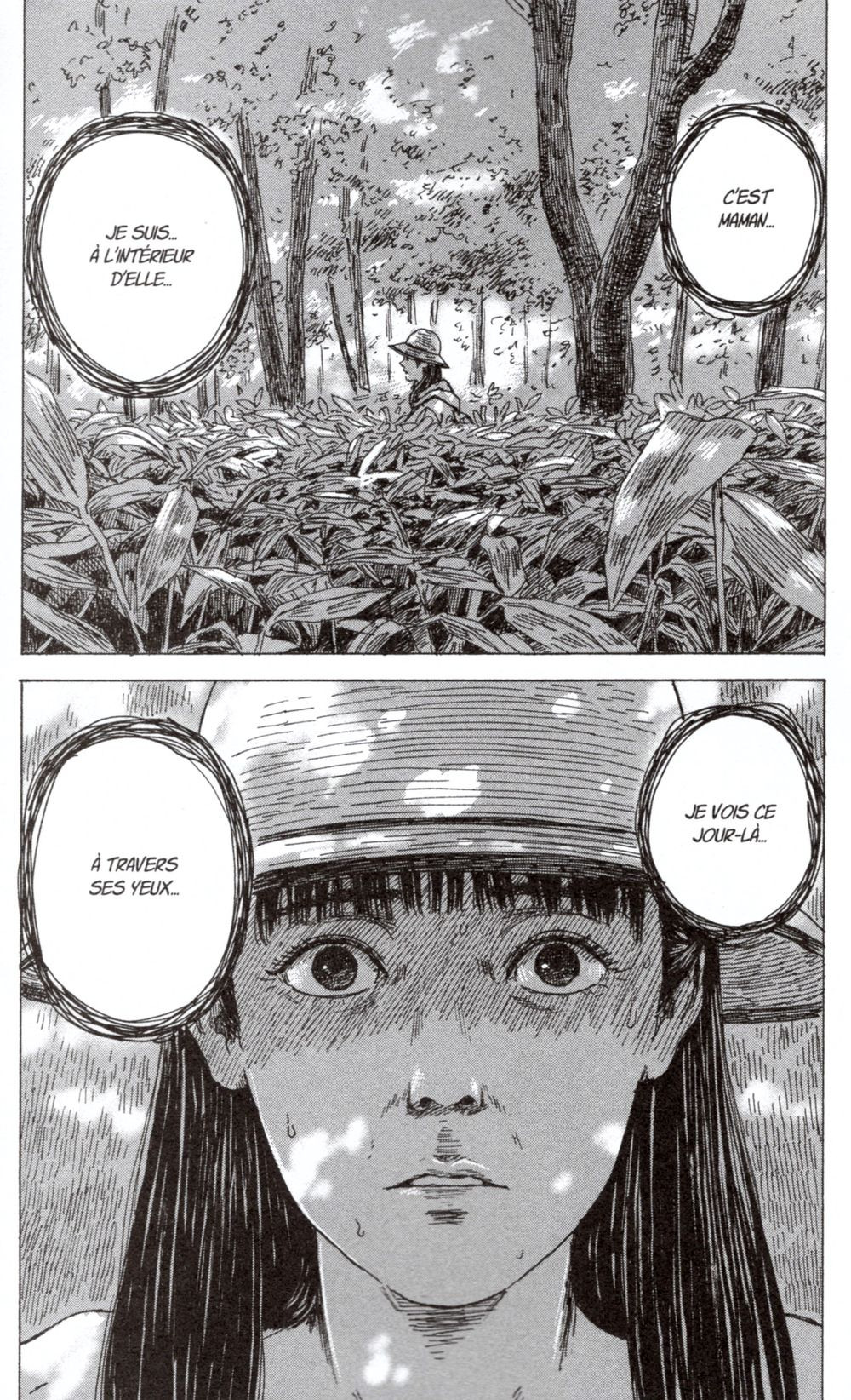 Shuzo Oshimi donne encore plus d’obscurité à son récit. Le sentiment de malaise reste toujours omniprésent. Seiichi est au coeur du récit. Il perd de plus en plus pied et n’arrive plus vraiment à différencier le réel et l’imaginaire. A cela se rajouter des questionnements à n’en plus finir. Il arrive même à se convaincre que la folie et la tristesse de sa mère sont de sa faute. Par conséquent, il doit mourir lui ou son alter-égo qu’il perçoit dans Shigeru. Donc normal de l’avoir pousser et poursuivre l’oeuvre de Seiko. A la police, il avoue tout avec même un sourire libérateur. Puis il poursuit sa mise à nu, même littéral lorsqu’il est accompagné à la maison d’arrêt et doit changer de tenue après une inspection complète. Commence t’il à s’enfoncer dans la folie transmise par sa mère? Ou va t’il pouvoir devenir enfin lui même malgré les manipulations qu’il a subit? En tout cas, rien de bon ne peut vraiment sortir. On s’en doute grâce à la noirceur des dessins qui évolue encore ici avec plus de travail sur les ombres et des traits plus marqués dans les visages. Jusqu’où peut-on tomber? Le mangaka a du prévoir des rebondissements pour toujours saisir le lecteur.