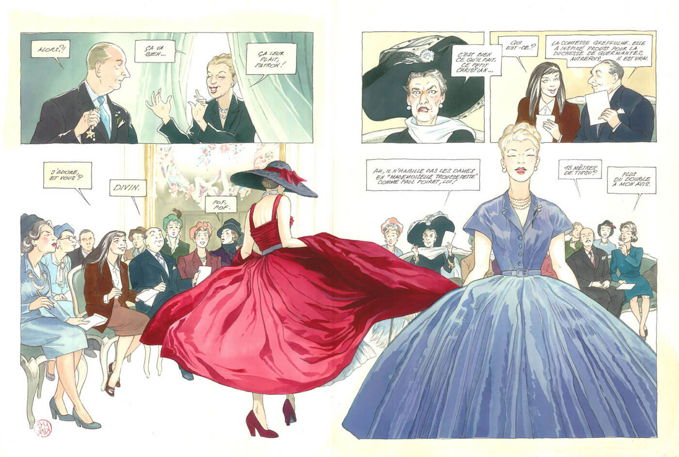 Dans une envolée de longues jupes corolles, le défilé commence. L’assistance est médusée : c’est un triomphe ! Carmel Snow, du Harper’s Bazar, s’écrie : « It’s quite a revolution, your dresses have such a new look! » En un mot, la carrière du couturier est lancée, et l’histoire de Clara commence. Jeune fille en Dior est un roman graphique ; une biographie dessinée et romancée qui ouvre l’univers de la mode et de la haute couture à la bande dessinée.