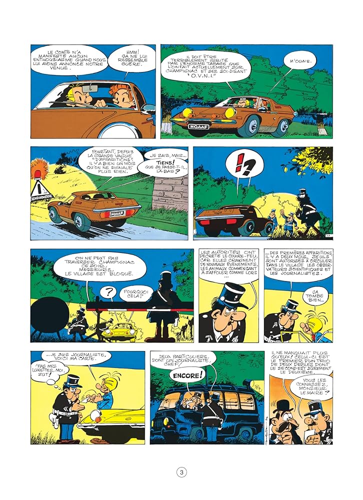 Déjà, le titre a quelque chose d’intriguant. On assimile à la fois le cidre et les extraterrestres. Il n’est pas facile de prendre la suite de Franquin avec ces héros. Trouver son style sans trop modifier celui d’avant est périlleux. Les blagues fines prennent la place à des choses plus ampoulées. Le trop est souvent l’ennemi du bien. On se laisse porter par les situations les plus rocambolesques les unes des autres. Les petits hommes pas vert sont venus se former à la mycologie à Champignac. Ils ne mangent pas de soupe aux choux et les navettes sont particulières. Les ksoriens sont très gentils. Le comte maîtrise parfaitement l’art des champignons. Il adore même donner des informations scientifiques par exemple sur la difficulté de parler de ces êtres d’une autre galaxie. « Ils parlent notre langue, mais en ultrasons, ce qui nous les rend inaudibles, de même que notre voix leur parvient en ce qui est pour eux des infrasons, d’où incommunicabilité complète. J’ai donc construit ces casques qui reçoivent notre voix et la leur restitue en ultrasons, de même qu’il capte leur voix au niveau du larynx et la restitue dans la gamme des sons audibles par nous à travers ce petit haut-parleur frontal. » (p. 10) . Cela amène bien souvent à des situations très problématiques. Les méchants sont au rendez-vous et mettent les moyens. Les armes à feu sont de légion ce qui peut paraître très violent au vue de l’âge des lecteurs. Même si beaucoup de gens en possèdent chez eux à la campagne, l’objectif n’est pas forcément de tuer des gens. Est-ce une façon de la légitimer? L’humour a ces limites selon ces époques.