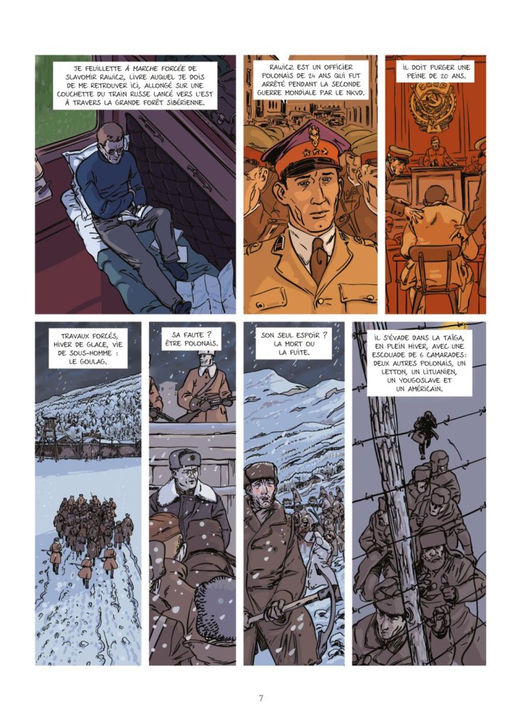 Il n’est plus nécessaire de présenter Sylvain Tesson. L’homme a construit sa réputation autour de ses voyages qui se retrouvent dans des romans, des documentaires et aussi des bandes dessinées. « L’axe du loup » est la troisième adaptation de ses pérégrinations à l’autre bout du monde. On peut se demander si le support BD apporte quelque chose de plus que l’angle économique. En tout cas, cela permet à des lecteurs bd de découvrir son travail et vice-versa. Le voyageur part sur les traces des évadés du goulag, depuis Iakoutsk jusqu’au Golfe du Bengle. Le dessin rend magnifique les paysages toujours assez infini et souvent vert. Par contre, les visages et les corps c’est autre chose. On est moins dans le détail et la précision. Ce qui explique d’ailleurs que l’auteur soit toujours assez loin. La structure se fait à travers des chapitres et des zones géographiques. Ainsi le lecteur sait parfaitement où il se situe. Néanmoins, il manque des éléments comme ces rencontres sur des morceaux d’itinéraires. Que sont-ils devenus? Ou sont-ils allés? Qu’importe tout est centré sur une seule personne. Quand il se blesse, il ne prend le temps de repos. On sent la notion de surhomme. Plus fort que la nature, les éléments et même son corps pour atteindre son objectif. Il s’adapte à merveille face à toutes les rencontres qu’il fait. C’est surtout des hommes bourrés qui font n’importe quoi et qui peuvent être très agressif. Donc une bonne résistance à l’alcool est obligatoire. Face à la misère, est-ce la seule solution? On n’aborde pas la question des violences conjugales qui est l’autre pendant. N’oublions pas l’objectif qui reste le plus important. Sur sa route, il rencontre beaucoup de gens très généreux qui lui offre gîte et couvert et ceux méfiant, choisissant l’errance, donc le danger potentiel. On est fatigué comme le voyageur avec l’envie de rentrer chez soi.