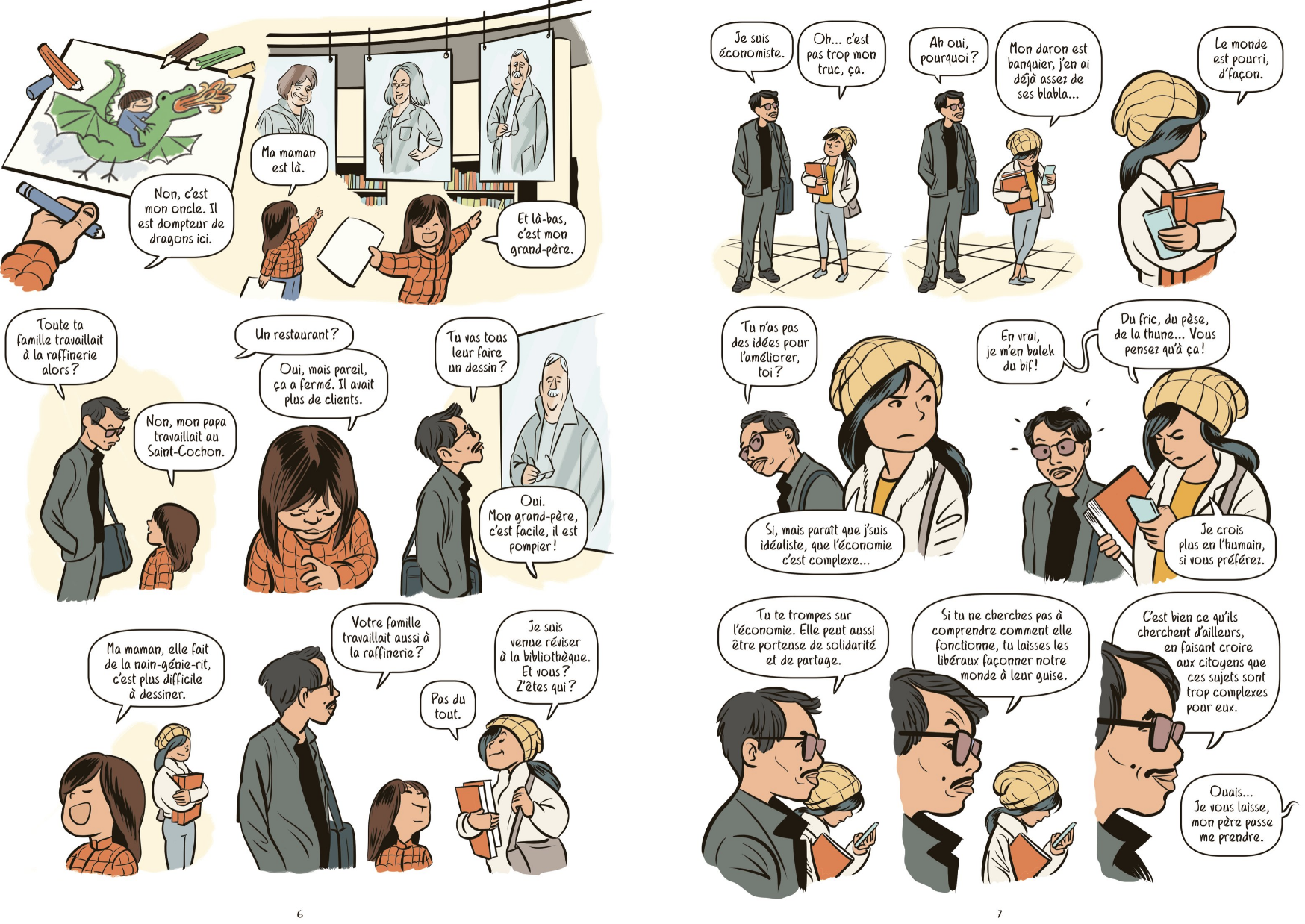Les dessins de Ludivine Stock donnent un ton vivant et léger, rendant des concepts complexes aisément compréhensibles. L’approche est résolument engagée, souvent critique du libéralisme, tout en esquissant des pistes vers une économie plus équitable, combinant secteur public et privé. La force de l’ouvrage tient dans sa pédagogie efficace, mais celle-ci exige du lecteur qu’il soit attentif et prêt à approfondir certains passages. « On a fait la même chose en 1945, avec une dette proche de 200% du PIB. Elle a été ramené à 30% en moins de dix ans… – Sans toucher aux dépenses publiques? – Au contraire, on a créé la Sécurité sociale! Comme l’a montré Thomas Piketty, avec les nationalisation d’après-guerre, la puissance publique détenant en France en 1950 au moins 25% à 30% du patrimoine national et même plus de 50% des entreprises et financiers. Si on avait baisé les dépenses publiques, on n’aurait jamais connu les Trente Glorieuses. A l’époque, l’arbitrage s’est fait en faveur du peuple, contre les intérêts des très riches, des banques et des détenteurs d’actions. Aujourd’hui, c’est l’inverse. Le capital national, c’est-à-dire la valeur de toutes les entreprises, les bâtiments, les terrains, est à 95% privé en France. D’où l’importance de faire émerger un nouveau récit! » (p. 98). On aurait d’ailleurs apprécié d’avoir plus de sources en bas de page et des sources très diversifiées en fin d’ouvrage. Les critiques négatives soulignent le partie pris et des sources que de personnes qui partage l’opinion. Alors que l’on cite la cour des compte ou France stratégie sur des rapports, on aurait aimé les avoirs les noms et dates pour aller vérifier et s’approprier le savoir. « Plus ils sont riches, plus leurs impôts sont élevés proportionnellement sauf depuis l’élection d’Emmanuel Macron pour les 0,1% les plus riches dont le niveau d’imposition a baissé de 4,5 points. – Et comment ont-ils utilisé les baisses d’impôts? – Les 0,1% les plus riches ont doublé leurs dividendes. – Mais ça a fait revenir des ménages riches en France quand même? – Quelques centaines… Sur 150 000 foyers assujettis à l’impôts sur la fortune, fe n’est pas fignificatifff. » (p. 121).