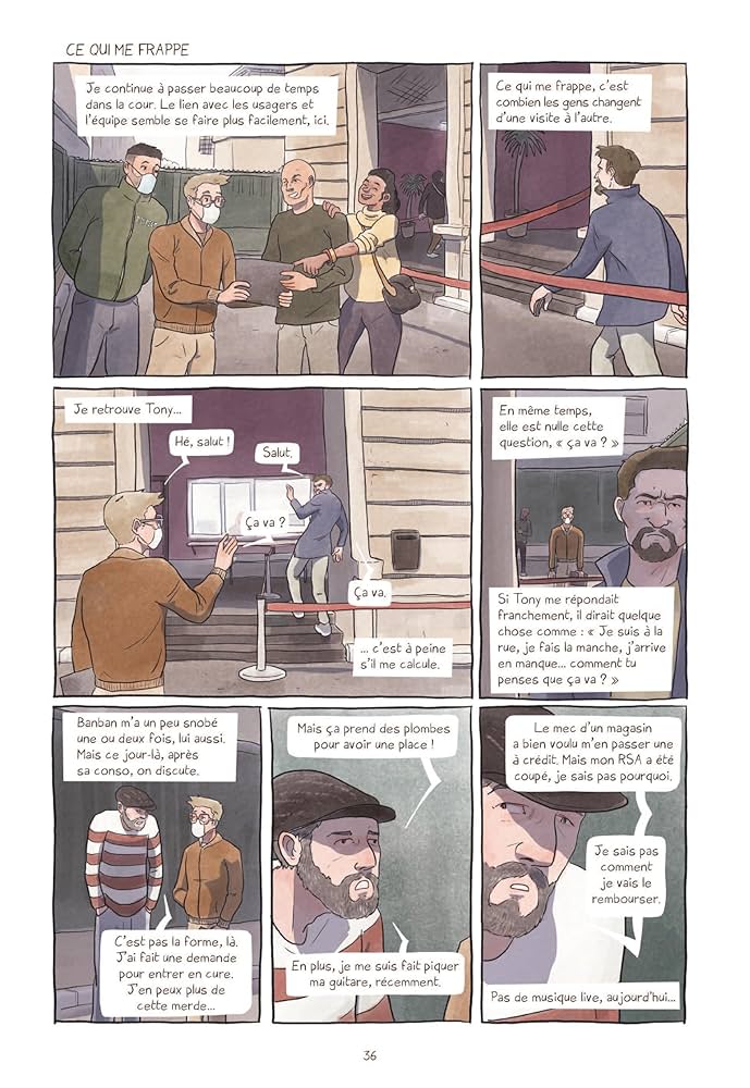 Le récit est ponctué de portraits touchants, comme celui de Banban, musicien aspirant à une reconnaissance dans le métro parisien, ou de Tony, dont les parcours de vie chaotiques illustrent la complexité des trajectoires individuelles. Ces témoignages, loin de toute victimisation ou héroïsation, offrent une perspective authentique sur les défis quotidiens auxquels sont confrontées ces personnes. On apprend qu’il faut au moins 6 cures pour décrocher. Le scénariste ne se contente pas de relater les événements observés. Il s’implique personnellement, partageant ses réflexions, ses doutes et les impacts de cette immersion sur sa propre vie. Cette dimension introspective enrichit le récit, le rendant d’autant plus poignant et sincère. Et surtout cela nous renvoie à notre posture et notre regard sur ces consommateurs que l’on voit dans la rue. La pauvreté et la précarité sont riches d’imaginaires péjoratives. Les salles de consommation ont pour fonction de pouvoir proposer un cadre de sécurité et de socialisation. Quand on a perdu tout lien avec les autres, comment se projeter dans une société normative? Déjà proposer ce lieu est déjà un premier pas pour voir le monde autrement. Ceux qui veulent plus, c’est possible. L’ensemble des personnes présentes les aide quand ils en font la demande. Cela ne sert à rien d’aider des gens qui n’ont rien demandé. Ils ne sont pas prêt à s’engager. Proposer un endroit sécurisé est déjà faire quelque chose. On ne sort pas de l’addiction en un claquement de doigts surtout avec des produits comme la coke. Pour l’instant, on ne peut se sevrer. La consommation de drogue augmente surtout auprès de cadres par exemple qui pour être performant en prennent quotidiennement. Eux sont invisibilisés par les médias et pourtant, ils restent majoritaires.