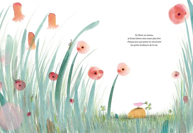 Un enfant se glisse dans la peau de cet oiseau, enchaînant des images de voyages sensoriels. Il « jouerait à saute‑mouton avec les vagues », sentirait ses plumes au goût du sel, boirait l’eau glacée des rivières et répondre avec bienveillance aux mille questions des grenouilles curieuses . Le texte minimaliste se déploie avec une économie de mots remarquable, chaque phrase s’imprègne de poésie, contemplant les beautés simples de la nature et des petits gestes de vie. Les illustrations, dans des tons pastel doux et lumineux, évoquent une invitation au voyage intérieur et à l’attention aux détails, à la manière d’immenses haïkus visuels.