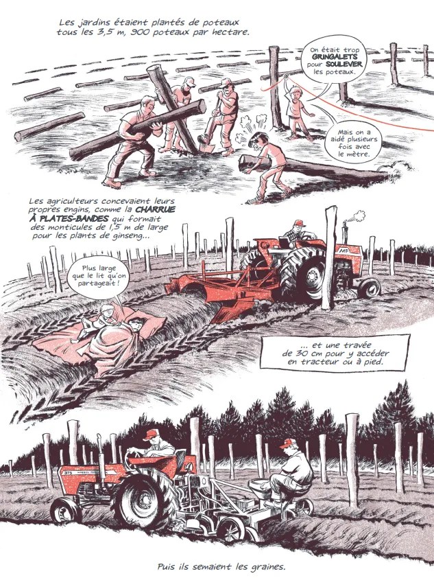 Enfants au début des années 1980, Craig, son frère Phil et sa soeur Sarah ont travaillé toutes leurs vacances dans les champs de ginseng du Wisconsin, afin d’aider leurs parents à joindre les deux bouts. De cette activité éprouvante, Craig a conservé l’amour des comics achetés avec l’argent gagné à la sueur de son front et des soucis de santé probablement causés par les pesticides massivement employés dans l’agriculture intensive. C’est en cherchant de nos jours un remède en médecine douce à ses problèmes qu’il en est venu à se pencher sur cette plante quasi miraculeuse, le ginseng. Entre documentaire et biographie familiale, le middle west et la Chine, une enquête qu’on dévore avec passion.