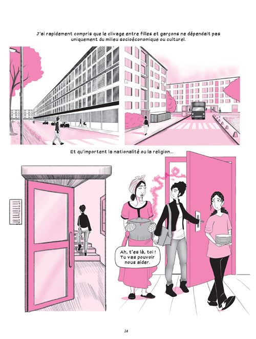 Chadia Chaibi Loueslati propose un album pour partager un récit de sa vie et d’une réfléxion. Lors d’une soirée avec ces filles, elle leur partage une anecdote lorsqu’elle aussi était une adolescente. Issue d’une famille nombreuse, les parents avaient leurs idées bien conçues sur les filles et les garçons. Les filles portent l’honneur de la famille avec leur virginité. Si elle sorte, elle risque de rencontrer un garçon qui peut leur voler ou elle peut le donner. Mais en cas de viol, elle est répudiée et n’a plus sa place auprès de sa famille. Elle est devenue un produit impropre à la vente. Alors que les garçons font ce qu’ils veulent, même un viol. Qu’importe les répressions ne viendront pas le taquiner d’aucune façon. Il pourra même s’enorgueillir avec ces potes et revendiquer une posture de virilité. Alors comment faire pour essayer de s’épanouir dans une famille ultraconservatrice? Elle n’a pas le droit de choisir ce qu’elle va porter. Elle n’a pas le droit de sortir seule à part pour l’école et la bibliothèque. Elle n’a pas le droit de choisir son parcours scolaire. Que lui reste t’il? Un petit bout à l’école avec la bande de pote, alors elle peut fumer et rêver de garçons. En plus, une fille de la cité s’est faite violer. La fille a du partir et lui, continue sa vie l’air de rien. La bédéaste a du même fugué pour respirer un peu. Là elle est confronté à d’autres filles dans des situations très graves. Au final, elle est revenue dans sa famille et a eu son bac. L’intérêt de la bd montre une parole libre et les réflexions sur les libertés des femmes et les constructions mentales. Et elle montre une famille arabe, très très rarement représentées et sans les clichés racistes qui vont avec. La représentativité est nécessaire surtout dans le 9e art. Par contre, cela reste assez gentil sans être plus poussé avec la présence de la religion, la volonté de conformisme sociale, la volonté de changement de classe pour les enfants, les contractions marquées dans le discours, la violence, les menaces… C’est assez léger et surfait. Surtout quand on voit la couverture, on s’attend à la vraie révolte, de la colère, des chamboulements profonds… On s’attend à un récit de lutte profonde avec l’acquisition de droits. Du coup, la déception se fait. C’était sympa à lire car le dessin est très lisible, la police d’écriture assez grosse, peu de texte à lire… La bichromie avec du rose incite à se concentre sur l’essentiel, l’amour de la famille.