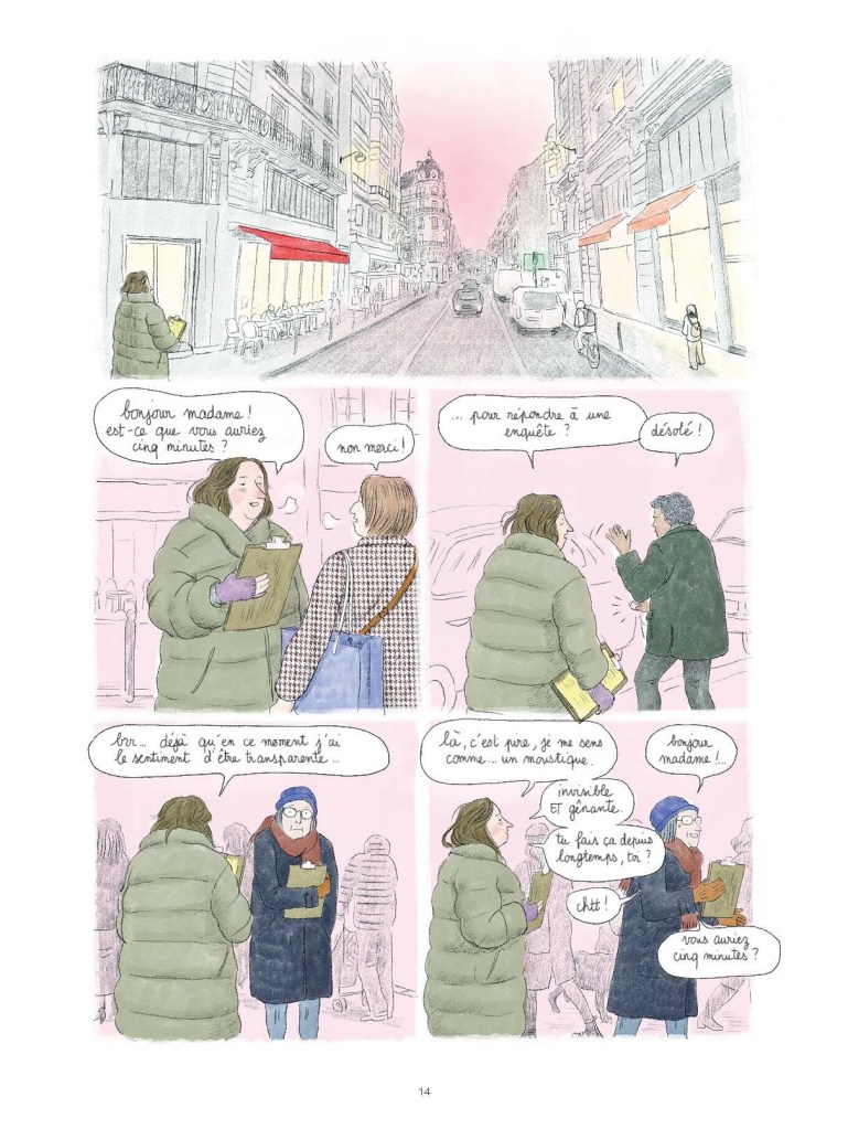 Les femmes de 50 sont assez peu représentées dans l’ensemble des médias. Elles ne sont pus des produits de consommation et de fantasme pervers. Donc pourquoi montrer ce qui ne fait rêver? On pourrait dire parce qu’une femme continue à exister même après 50 ans. En effet, son corps change et elle doit passer à une autre étape de sa vie. Marcie sait qu’elle est invisible. C’est son don. Pour continuer à vivre dignement avec sa fille adolescente, elle accepte les boulots qui veulent bien d’elle. Par conséquent, elle fait des sondages dans la rue. Puis un jour, par tristesse, elle va chez Dulac, la plus ancienne agence d’enquêteurs de France. Personne ne la remarque jamais, n’est-ce pas la qualité première d’un bon détective? Le patron doute un peu au début. Il lui donne des petites missions comme retrouver des chiens volés. Puis elle trouve une femme tombée d’une fenêtre gravement blessé et un homme fuyant avec un drap sur la tête. La famille lui demande de trouver le coupable. Elle y trouve du plaisir à mener l’enquête et même partir à New-York. On s’attache à cette femme pleine de doute, de peur et d’amour pour sa progéniture. Il n’est guère difficile de comprendre la situation. Elle n’est plus un objet de désir donc elle perd tout intérêt aussi bien sur le marché du travail qu’amoureux. On se laisse porter avec sourire de cette enquête hors du commun. Les dessins de Cati Baur permettent toujours de créer une ambiance délicate, rassurante et douce. Un combinaison assez réussi qui nous fait passer un très bon moment de lecture.