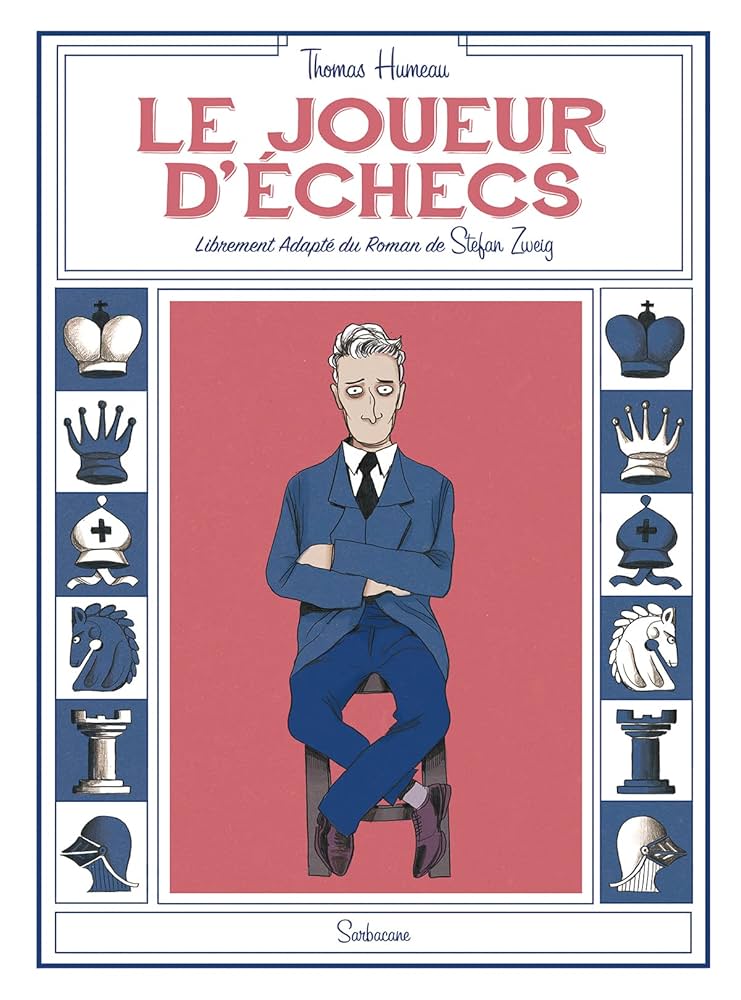 C’est avec une forme d’appréhension que l’on se plonge dans la bd. On s’était plongée avec émerveillement dans l’adaptation du roman de Zweig de David Sala. La surprise était totale en se plongeant dans l’adaptation de Thomas Humeau. Déjà, sur la couverture, c’est noté « librement adapté ». En effet, quand on débute la lecture, nous sommes désarçonnés. Rapidement, on arrive à raccrocher les wagons. Cette approche est assez fine et remet aussi la femme au coeur de l’histoire. A cause d’elle, deux hommes liés par les échecs vont s’affronter. L’un, issu d’un milieu pauvre a développé une compétence sur la compréhension d’une stratégie complexe. Ces compétitions deviennent le seul moyen de donner du sens à sa vie. Son côté asocial devient un problème et l’isolement du jeu devient confortable. Pour l’autre, c’est lié à un souvenir très traumatisant. Il avait caché de l’argent pour protéger des gens dont leur vie était en péril avec l’arrivée au pouvoir officiel des nazis. Ils l’ont torturé pour avoir les informations. Grâce à un livre de stratégie d’échec, il arrive à libérer son esprit. Il devient fort psychologiquement jusqu’à la démence totale. Quand il rejoue et gagne contre le champion du monde, la folie l’habite. A partir de ce jour tout change, pour le mieux? On ne sait pas. En tout cas l’approche est originale et on se laisse porter. Les couleurs en aplats permettent un apport frontal très à propos. On n’a pas le temps de s’ennuyer. Les mixes des couleurs est adaptés avec des rouges et des bleus/mauves. Une pleine page avec des arbres attire le regard et nous fait rêver. Toutefois, on reste sur notre faim quand on termine l’album. N’est-ce pas fidèle au livre? Une lecture qui mérite le coup d’oeil et de comparer avec l’autre publication. Rien de tel pour travailler notre esprit critique.