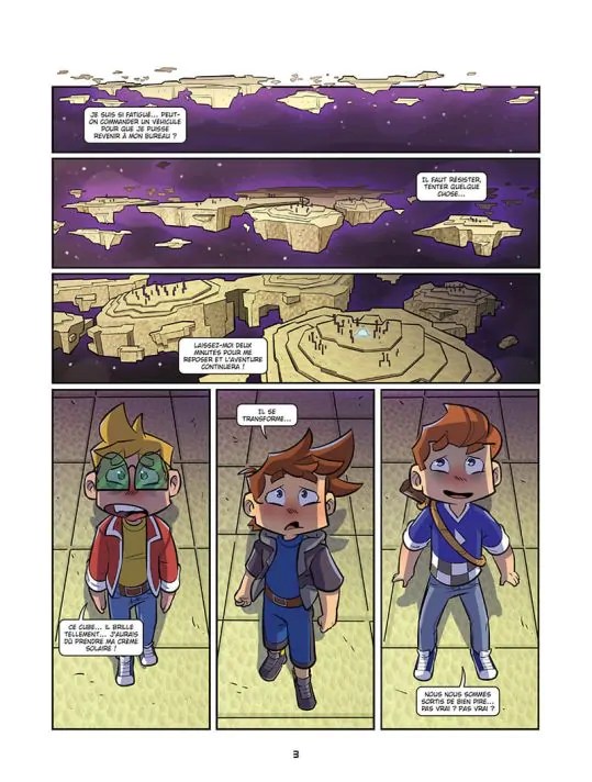 Quelle bonne idée de rassembler trois héros populaires de l’univers Minecraft en un seul album. Vous pourrez continuer à suivre le ou les gars dans leur série propre et aussi les retrouver dans d’autres aventures en équipe. Quelle chance qu’ils soient tous les trois orgueilleux, égocentriques, blancs et cisgenres comme ça on garde une forme d’uniformité. En team, ils se complètent assez bien entre celui qui a des pouvoirs magiques, l’autre qui aime les armes blanches et le troisième qui regarde sans rien faire mais pas sans rien dire. Ils ne viennent pas seul dans l’univers parallèle. On les affuble de leur binôme avec un panda, un chien et un cube parlant. Ils s’allient pour trouver le gros vilain qui leur a piqué leur oeuf d’Ender Dragon. D’ailleurs, ce mot est orthographié différemment dans l’ouvrage. On se demande bien pourquoi. Car derrière au scénario, on retrouve LE scénariste qui écrit toutes les aventures fictives des youtubeurs à succès. Le créatif maîtrise grandement ce genre de récits car il en a pléthore à son palmarès. C’est pour ça que nous ne sommes jamais perdus dans la lecture et que cela reste cohérent avec les autres bd. Pour la couleur, on reste pareil qu’avant car Arianna Sabella a déjà travaillé sur deux des trois séries. Pour le graphisme de Silvia de Ventura, il est plus dynamique et punchy. Il donne une vision plus jeune. Par contre, Frigiel et Siphano se ressemblent assez. Leur tête carré se compose de yeux bleus et de cheveux châtains avec un coupe différentes. Et au niveau vêtement, ils aiment les hauts bleus. L’originalité il y a sur un point car pour le reste cela reste standard et conforme aux attentes lecteurs. Nous ne sommes pas dans un 48CC et non, c’est 56 pages. A la dernière page, nous avons la promesse d’une suite diabolique. Ces femmes rousses, toujours des méchantes…