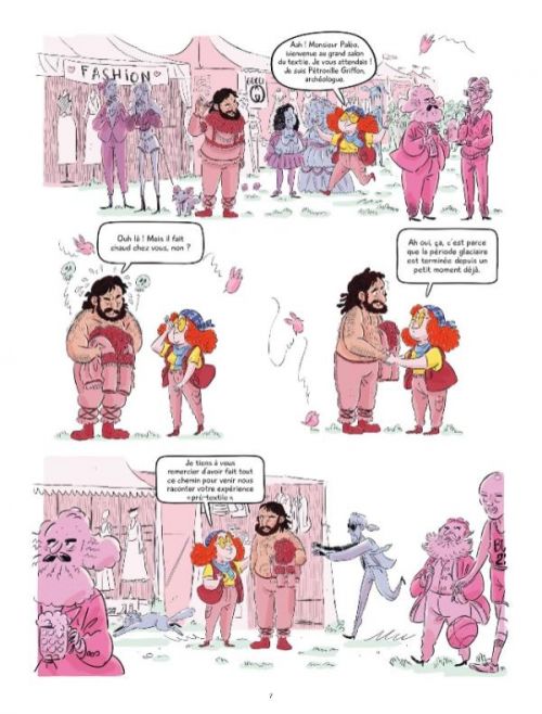 Séverine Laliberté et Audrey Millet ont fait un choix audacieux dans la mise en récit. Tout débute pendant le Grand salon du textile. Les scénaristes s’incluent comme les personnages centraux de l’aventure et font intervenir des acteurs de différentes époques, pays et langues. Avant de se lancer dans des interactions de folie, il est nécessaire de poser le cadre. Tous les faits avancés sont prouvés scientifiquement. On évite toutes les hypothèses pas fiables. Une approche sérieuse et ludique qui permet une accessibilité à grand public et avec des choses vraies, concrètes, faisant aussi travailler l’esprit critique. Déjà abordé l’Histoire à travers des faits est un gage de sérieux avec une démarche scientifique. Et souligne également les limites de l’excercice car le tissus se délite avec le temps.