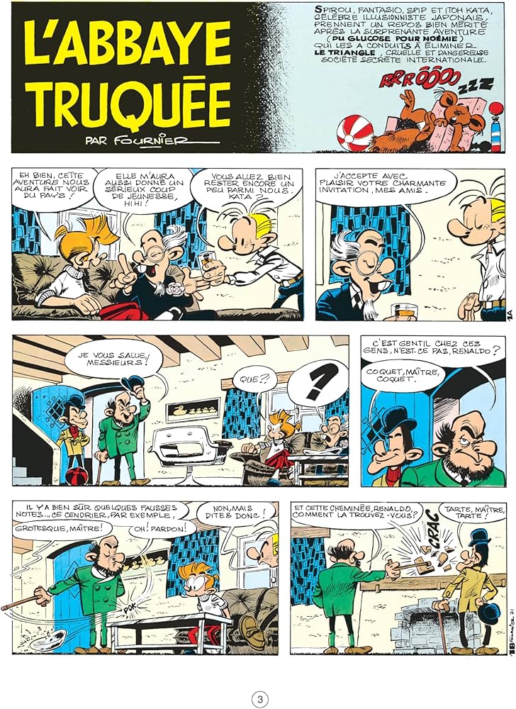 Jean-Claude Fournier n’est pas Franquin. Il a fait de son mieux pour mettre son énergie au service d’une série. Par chance, il a gardé les grandes lignes. Pour une fois, Spirou et Fantasio n’expose pas trop leur syndrome du sauveur. Là, ils n’ont pas le choix d’agir pour sauver, Itoh Kata. Avait-il vraiment besoin du duo de compère? On en doute vraiment puisqu’il arrive à retirer des cordes qui lui entravaient les mains ou sortir d’un coffre. C’est un magicien très doué. Même dans son chapeau se trouve des animaux. Il montre aussi une différence parce qu’il est d’origine japonaise. Donc il se courbe pour dire bonjour et merci. Dans les onomatopées, on voit des hiraganas et les katakanas pour dire des insultes. L’homme est aussi très serviable. On voit l’utilisation de clichés au service du récit, comme le faisait les prédécesseurs. Là aussi, les femmes sont aussi totalement absentes. Elles ne servent à rien. Les méchants sont aussi très binaires. Déjà dans leur nom comme Charles Atan. Tout est dit. Franquin aurait trouvé quelque chose de plus fin. Au moins, les plus jeunes peuvent comprendre. Les rebondissements dans l’abbaye restent assez prévisible. Toutefois, on se laisse porter par les mécanismes complètement loufoque et des sous-fifres peut malins. Ils se tapent dessus et croient tout ce qu’on peut leur dire. Heureusement Spip est là pour apporter des doses d’humour et d’ingéniosité. On passe un bon moment et cela donne envie d’aller plus loin pour découvrir la série.