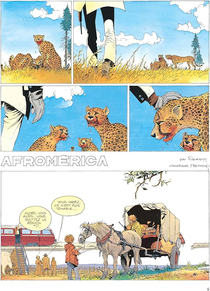 On trouve deux camps, ceux qui veulent faire du lien et ceux qui veulent s’isoler. Jeremiah et Kurdy se retrouvent malgré eux au milieu de ce bordel qui sent la guerre avec des relents de haine avec le rappel à l’esclavagisme. La tension monte progressivement avec des rebondissements assez bien amenés. Kurdy apprend à des enfants à se servir de lance-pierre avec précision. Il partage avec plaisir car lui aussi possède une âme d’enfant et d’espièglerie. Les gamins lui rendront bien son implication envers eux. Le méchant a posé des puces sur des gros félins pour les manipuler afin de tuer qui il veut. Dévorer un humain, c’est très facile pour elles.