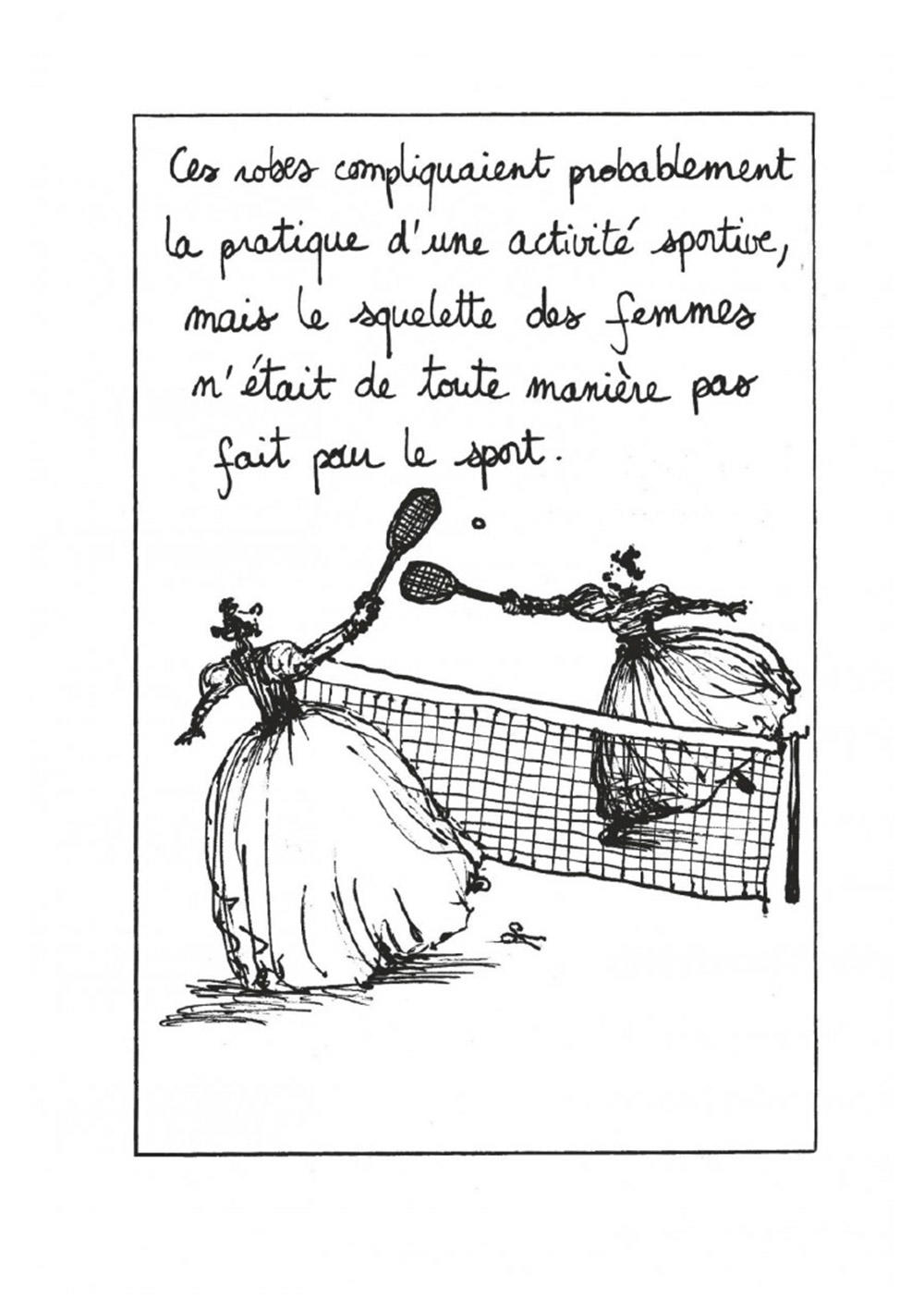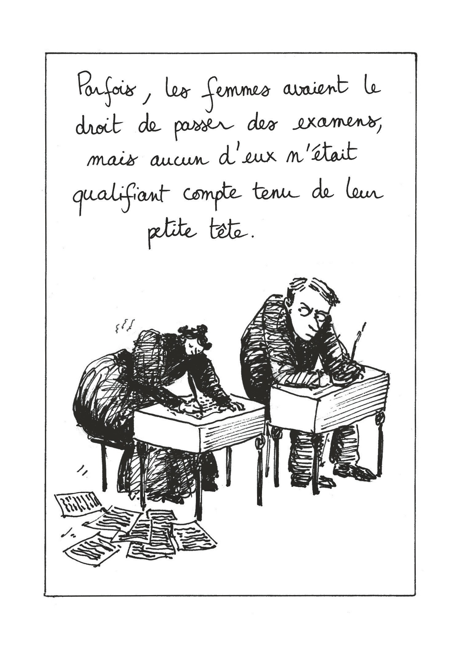 Le Problème avec ces fameuses bonnes femmes, c’est qu’elles ne veulent jamais rester à la place que les hommes leur ont attribué. C’est pourquoi, ils ont usés de leur talent de persuasion et d’ingéniosité pour montrer leur supériorité en tout point, surtout pour les choses qui rapportent et qui mettent en valeur. Jacky Fleming décide de mettre son talent, son imagination et son regard de féministe pour faire un bilan historique sur le patriarcat. « Autrefois, les femmes n’existaient pas et c’est pour cette raison qu’elles sont absentes des livres d’histoire. Il y avait des hommes et, parmi eux, un certain nombre de génies ». Même Darwin, père d’une théorie évolutionniste à souligner que la place était à la maison car elle est biologiquement inférieure. La sphère domestique est bien adaptée à leur condition corporelle et physique. Et après tout, leur fonction principale n’est-elle pas de faire des enfants? Bien entendu, dans le cadre du mariage sinon on pourrait croire que c’est une gourgandine voir une femme déchue (pas de tutelle d’un homme). Pour qu’elle reste bien à leur place, on leur imposait des vêtements inconfortable, imposant et qui influençait la morphologie du corps. « Ces robes compliquaient probablement la pratique d’une activité sportive, mais le squelette des femmes n’était de toute manière pas fait pour le sport. » Et puis leur cerveau n’est pas fait pour apprendre non plus ni pour réaliser aucune activité artistique. Le poids du pinceau, c’est tout un problème. Quand une faisait un chef d’œuvre, forcément, il y avait aiguille sous roche. Le vrai souci est leur émotivité qui les rend inaptes à tellement de choses si pragmatique. Freud, Schopenhauer, Kant… y vont tous de leur théorie qui sort de leur observation. Misogynes vous dites? Ce terme n’existait pas l’époque. Cela doit être une invention féminine. La dessinatrice ne manque pas d’humour et de sarcasme à la mode anglaise. Elle va à l’essentiel avec quelques dessins en noir et blanc et quelques phrases percutantes. Et elle évoque également la couleur de peau où l’on nomme des femmes noires aussi qui étaient talentueuses. Rien de telle qu’une petite lecture de remue méninge pour nous rappeler que rien n’est jamais acquis quand on parle de droit de la femme. Les populistes, les fascistes, conservateurs… n’hésiteront pas à tout détruire pour remettre la gloire à la couille riche et blanche.