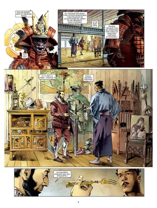 Thierry Gloris poursuit son récit pour nous mettre aux côtés de Nobunaga dans sa quête d’unifier le Japon. Un projet noble qui demande beaucoup de sacrifice. Par conséquent, sa vie et celle de son entourage sont perpétuellement en danger. Pour raconter cette partie de l’histoire, il invente un samouraï noir sur lequel on se focalise. Par défaut, il va jouer un rôle majeur dans la guerre lancée par Nobunaga. Nous sommes plongés dans les inlassables stratégies de conquête de territoires. Par conséquent, les cadavres doivent s’accumuler ainsi qu’une défiance constante. Rare sont les moments d’apaisement. L’approche se veut plus historique même si l’on se doute bien que l’aspect aventure et mort soient plus vendable. Une vision diamétralement opposée à celle proposée à travers un cuisinier du manga « Le chef de Nobunaga » de Mitsuru Nishimura et Takuro Kajikawa. Emiliano Zarcone propose un graphisme assez classique pour ce type d’album. Malgré les très nombreuses scènes d’actions, cela reste assez statique. Cyril Saint-Blancat propose des couleurs plus froides que son prédécesseur. Cela correspond très bien à l’univers créé. Le global est cohérent. Juste assez passionnant pour avoir envie de se plonger dans le tome 3.