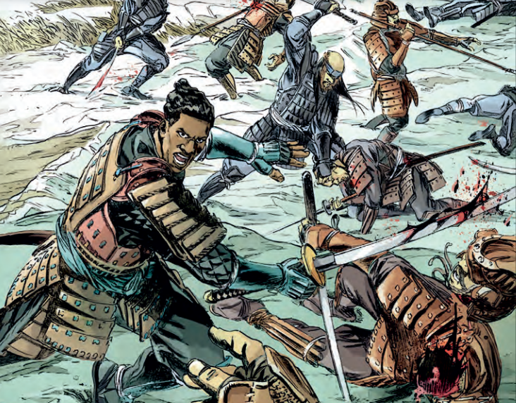 Kurusan trouve sa place auprès d’Oda. « La fortune m’a mis sur votre route. Je ne sais pas pourquoi. Mais pour la première fois de ma vie. J’agis sans crainte de la morsure du fouet ou de la colère d’un dieu étranger ». Le voilà dorénavant un bushi. Il sait maîtriser le katana, la naginata et l’arc. Le tout avec beaucoup de rigueur et de la réflexion. Le maître lui offre une armure ajuster à sa taille ainsi qu’une épée. A partir de maintenant, il n’est plus ni un esclave ni un animal. Donc, pour se former à son nouveau statut de samouraï, il est envoyé sur le front. Il fait des prouesses à tel point que les hommes le suivent les yeux fermés. Seulement, quand il tombe dans un piège, la donne change. Les choses empirent lorsqu’il se retrouve entre les mains de l’ennemi qui le torture. Par chance, une amie l’aide à s’enfuir. Une fois remis sur pied, il est d’autant plus motivé à massacrer. La soif de vengeance lui tient à coeur.