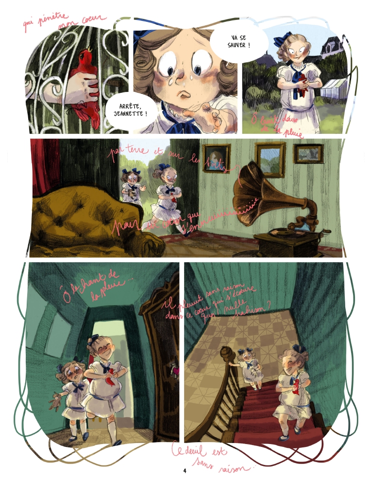 C’est reparti pour une nouvelle aventure de notre héroïne Lou. Maintenant qu’elle peut voir les fantômes, il faut les comprendre. Alors lorsqu’une femme sans visage se présente à elle plusieurs fois et qu’elle peut apparaître sur une photo prise par son amoureux, elle sait qu’elle doit enquêter. Mais les réponses n’apportent pas toujours le bonheur. Le premier tome commençait avec les parole d’une chanson de Téléphone, celui-ci débute avec la poésie de Verlaine « Il pleure dans mon coeur ». L’angle mélancolique est tout de suite annoncé avec une scène du passé qui cette fois n’est pas le Moyen-âge.