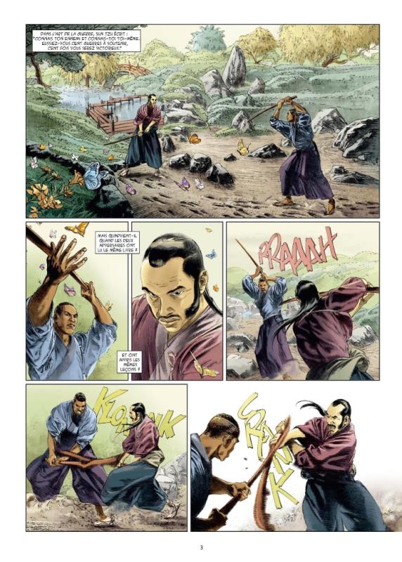 Thierry Gloris poursuit son aventure sur la conquête de la réunification du pays au soleil levant. Oda Nobunaga est ne figure phare de l’Histoire de la nation qui a vision avant bien d’autres. Un précurseur politique comme il y en a peu. Même si son portrait semble assez peu flatteur dans la bande dessinée. Il a l’air d’un homme frivole, égocentrique et cruel. Sans oublier cultivé tout de même, puisque nous avons des références à l’ouvrage culte « L’art de la guerre » de Sun Tzu. Néanmoins l’objectif à atteindre n’est pas cité comme si c’était anodin dans le récit global. Alors que pourtant c’est important à comprendre. Ce n’est pas juste un simple conflit pour avoir plus de terre, c’est une réforme complète du système. A la place le scénariste évoque d’autres chose. C’est l’opportunité de rappeler des pratiques propres à l’époque médiévale existant jusqu’à la fin du XIXe siècle. Cela se nomme le shudo ou wakashudo qui signifie littéralement : « la voie des hommes ». Les relations homosexuelles étaient ordinaires entre samouraïs voire encouragées. Un aspect assez peu révélé dans les représentations contemporaines. On se doute bien que l’homophobie n’y est pas pour rien ainsi que la construction de l’image de la virilité. Pour le reste, on continue comme avant avec des jeux d’alliances et d’esbroufes. La colère motive les uns à assassiner les autres, comme si c’était normal. La structure reste fidèle au genre sans impulser de grandes nouveautés. Emiliano Zarcone propose plus de grandes cases pour admirer soit des paysages boisés ou soit des scènes de combat. Un choix plus contemplatif et immersif dans l’action. Bien que cela reste encore très figé et que le dynamisme n’est pas vraiment au rendez-vous. Cyril Saint-Blancat contribue à donner un aspect calme et détendu malgré les têtes qui tombent. La suite se fait attendre avec un vrai rebondissement saisissant.