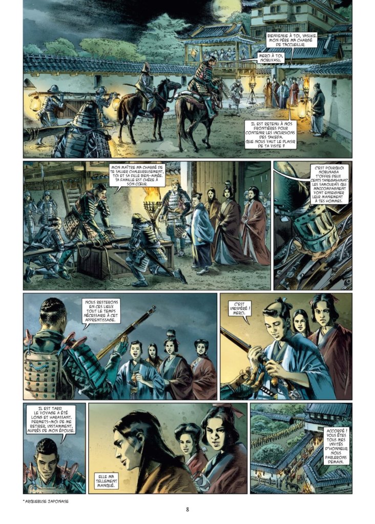 La guerre continue. Nobunaga poursuit son rêve d’unir le Japon. Pour y arriver, tout est bon à faire. Heureusement qu’il est un très fin stratège. Yasuke comprend son rôle et dirige des hommes. Dorénavant, sa motivation a changé de camp. Il ne veut plus tuer sans raison. Mariko occupe son coeur et ne voudrait la perdre pour rien au monde. « Un seul regard sur ton visage et tout mon être s’enflamme ». Oda l’a placé auprès de sa femme et surtout auprès de Ieyasu Tokugawa. Un atout important pour les conquêtes à venir. Néanmoins, il faut être vigilant car son épouse, dame Tsukiyama n’apprécie guère l’occupant et l’homme noir. Elle veut que son fils les trahissent pour son honneur. Pour la peine, le père confie l’éducation militaire au bras droit de son partenaire. « Contre tout attente, Nobuyasu s’est révélé un compagnon agréable et déterminé ». Il a les qualités que l’on attend de lui : force, courage et mépris de la mort. Mais à chaque fois que les nobles meurent, des proches crient vengeance encore et encore. Un cycle infini de massacre. « Mes ancêtres en soient témoins, je ne trouverai le repos de l’âme que lorsque tous les assassins seront réduits en poussière ». Ce jeu du chat et de la souris de la mort rythme le conflit. Jusqu’à quand?