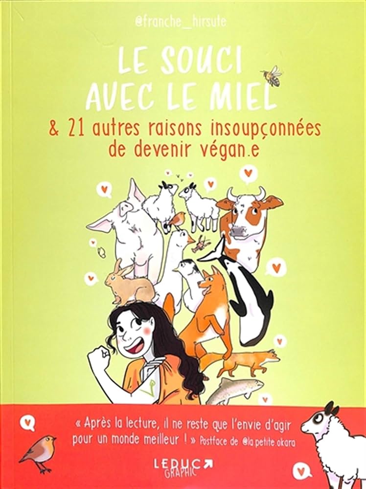 Il existe plusieurs albums sur le véganisme comme « Amour, gloire et végan » de Clara Cuadrado ou « Insolente veggie » de Rosa B. Mais ils abordent principalement leur rapport à la viande et la souffrance animale dans les abattoirs. Franche Hirsute choisit une approche, plus complète et plus pédagogique. A travers des grands thèmes, elle choisit de s’arrêter sur des choses bien particulières et qui sont dans la vie courante de chacun. Elle met les pieds dans le plat. Par exemple, on entend que l’on soulage la vache quand on la traie ou que l’on tonde un mouton. Mais c’est l’humain qui a créé la situation où il doit intervenir. Les vaches produisent du lait pour leurs petits et avant la laine des moutons tombaient naturellement. A force de modifier génétiquement les animaux pour le besoin des individus, on change leur fonctionnement et leur morphologie. Par exemple, une vache standard produit 4 litres de lait. Dorénavant, des races comme la Prim’Holstein en produisent 30 litres.