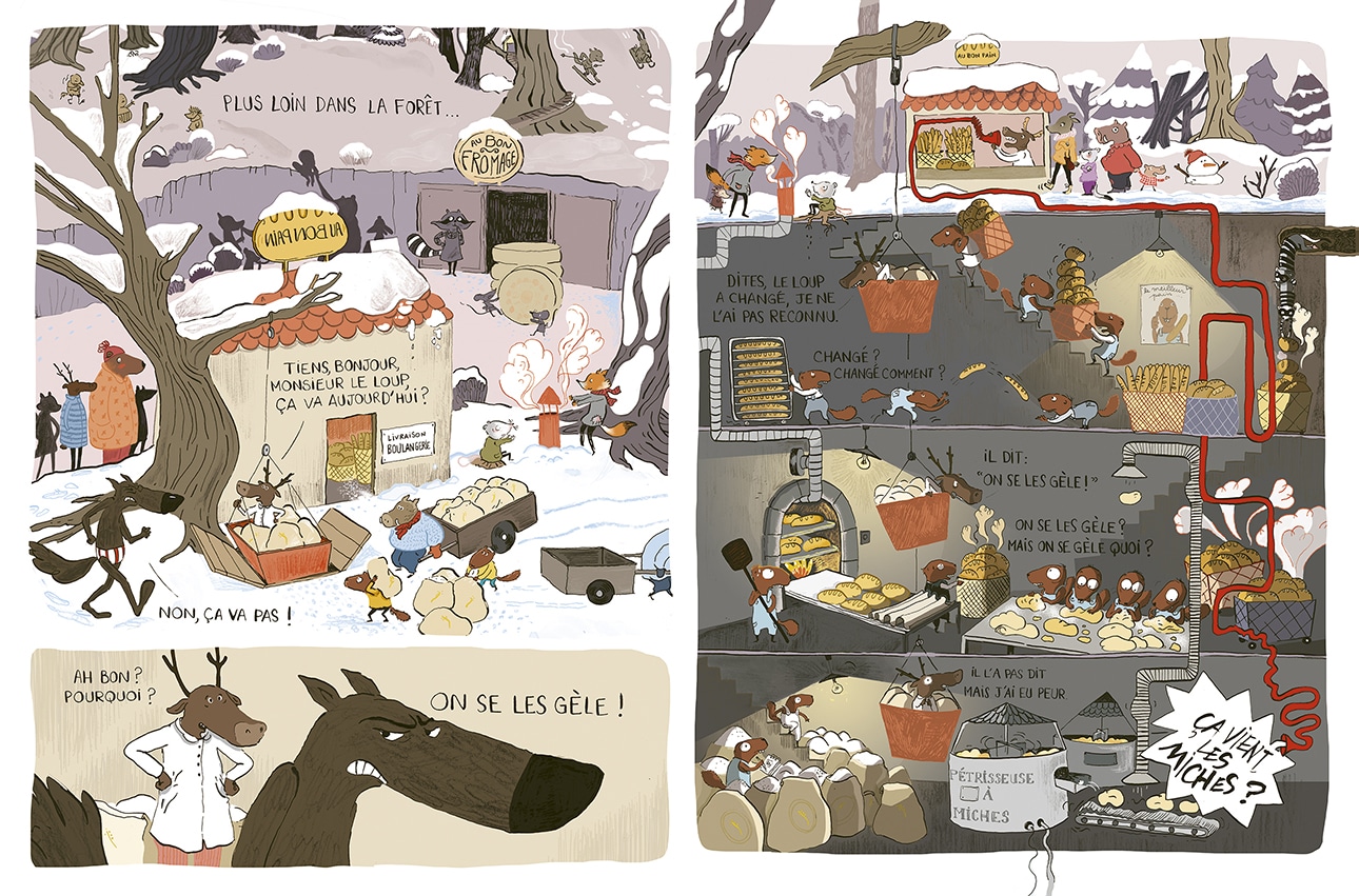 L’hiver est là et la forêt a revêtu son dense manteau neigeux. La plupart des habitants portent doudounes et grosses écharpes pour avoir chaux. Le loup en slip se balade toujours grognon et tout le monde s’interroge sur la raison.
