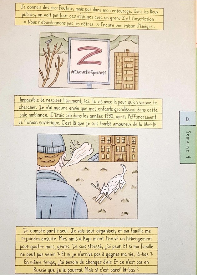 La guerre en Ukraine a débuté en février 2022. La Russie a envahi un pays limitrophe pour lutter contre le fascisme. Au début, beaucoup croyait que cela allait être un conflit assez bref. Mais la réalité est tout autre. Dans les médias comme en France, l’évènement est presque quotidiennement cité dans les journaux à l’image d’un fait divers. La mort est banale et lointaine. On déshumanise en relativisant à des choses pragmatiques. Nora Krug décide de remettre l’humain au coeur de cette inextricable situation. Elle met en page un échange entre deux individus qui ne se connaissent pas. D’un côté, on rencontre K., qui vit à Kiev, parent, journaliste de terrain et activisme. Elle documente les impacts militaire et social. De l’autre côté, D., artiste, qui vit à Saint Pétersbourg. Les deux retranscrivent les tensions vécues au quotidien, la peur de mourir, d’être mobilisé, de perdre son identité, d’être identifiée comme rebelle au système… Au final, les deux protagonistes n’ont pas le choix de fuir. Un déracinement fort qui amène à s’interroger sur son identité, son rapport à sa patrie et sa culture. En un an, beaucoup de changement peuvent se dérouler.