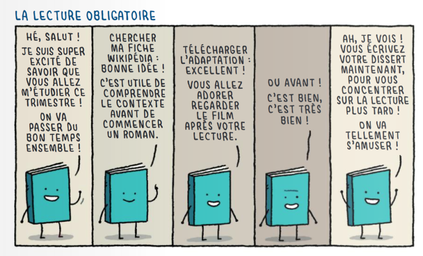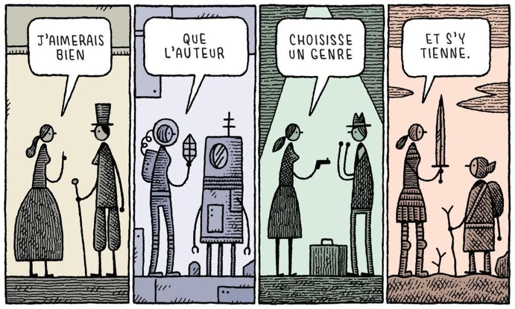 Tom Gauld est un créatif avec une très grande imagination. D’une simple situation, il sait en faire une synthèse en une seule page et une seule image. Il s’amuse avec les structures narratives, la construction des rebondissements, le choix des personnages, des temporalités… Sans omettre aussi les outils pour lire comme la tablette et d’autres objets qui n’existent pas encore et l’inutilité des prix littéraires. Connaître la littérature, sa construction, les moments clés.. ne sont pas donnée à tout le monde. Et en plus, pouvoir l’analyser pour en faire un gag en une page n’est pas donné à tout le monde. Tout n’est pas hilarant mais on sourit. On a envie de faire une photo de certaines pages pour les envoyer aux potes. Un vrai savoir faire plein d’intelligence, de connaissance couplé avec un dessin qui va à l’essentiel.Il possède un style simple et très efficace. Il n’a pas besoin de rajouter des détails à outrance pour être compréhensible. Les personnages, souvent juste des contours et formes noirs ou des personnages très précis et explicitent. C’est très ingénieux et brillant. Le dessin est au service du texte. C’est un plaisir à lire, à relire et offrir. Vous allez avoir envie de relire les albums car c’est toujours une bulle d’intelligence ingénieuse pour faire rire et sourire.