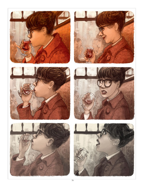 Il est rare de trouver des albums sans texte dans le rayon adulte. Ici il n’est pas question de proposer une lecture aux primo-lecteurs. Joris Mertens prouve que l’on peut raconter une histoire sans texte à destination des adultes. Dès la couverture, nous sommes intrigués par cette femme, au fond du bar qui est habillé tout en rouge. En déteint par rapport aux autres personnes et elle semble vivre des choses dans son imaginaire. Quand on a trouvé un lieu confortable pour se plonger dans la bande dessinée et ainsi, on se retrouve aux côtés de Béatrice. Tout comme ces congénères, elle vit un rythme de travail assez dense, basé sur des horaires assez similaire. Pas le temps vraiment de tisser des liens avec les autres. La tristesse s’affiche sur les visages de chacun dans les transports. Cet état d’esprit est magnifiquement traduit par la gamme de couleurs sombres utilisés. Il y a un sublime travail de la couleur, où l’on perçoit même la texture. Cette femme, le personnage central, sort du lot en portant du rouge. C’est un fil conducteur coloré qui nous tient entre les pages. Elle découvre un sac rouge abandonné sur le trottoir. Il a attiré son regard mais il est difficile de casser une dynamique dans la ville d’aller à contresens. Pourtant, le lendemain, il est toujours là. C’est comme si, il lui demandait prend moi et ouvre moi chez toi. Elle cède à la tentation et à partir de là, elle vit une aventure incroyable qu’elle ne pensait possible. C’est avec beaucoup de curiosité que l’on suit son périple palpitant et incroyable. Quand, elle revient chez elle, plus tard, elle déposera à nouveau le sac pour une autre personne. C’est très ingénieux de nous emmener ainsi dans un autre monde où la surprise est vraiment là. Une bd qui prouve que le texte n’est pas forcément utile pour raconter un récit surprenant qui nous tient de la première à la dernière page. On est admiratif aussi de la maîtrise du dessin, parfait, précis, chaleureux, évocateur… Et aussi la maîtrise de la couleur, qui nous plonge dans des mondes singuliers et si marqué. Une bd qui se dévore, se savoure et qui se conseille. Et aussi qui se reliera avec plaisir et se conseille sans aucun doute.